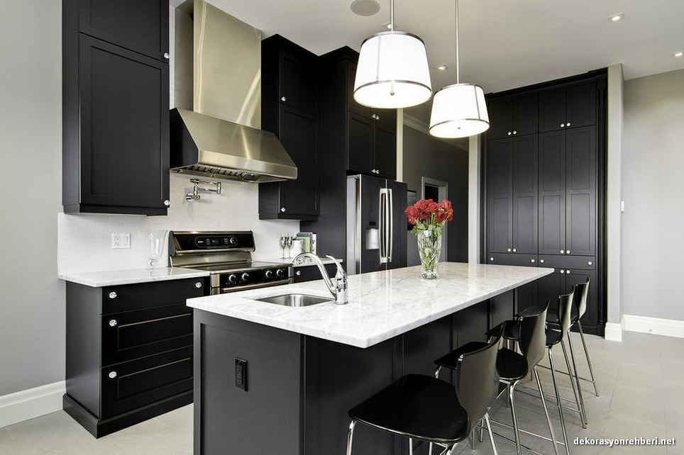 Bazı mobilyaları siyah tercih ederek farklı bir siyah beyaz mutfak dekorasyonu yapabilirsiniz. Evinizde mutfak dolabı ve diğer sabit mobilyaları değiştirmek istemeyebilirsiniz bu durumda eğer mutfağınız siyah ise mobilyaları değiştirmeden tabanını beyaza boyayarak veya duvardan duvara beyaz bir halıfleks ile zemini beyaz yaparak mutfak dekorasyonunuzu tamamlayabilirsiniz.